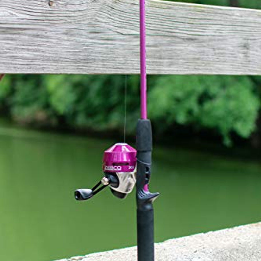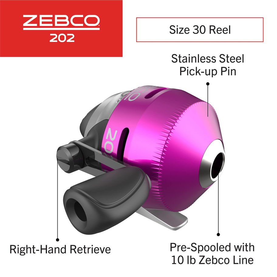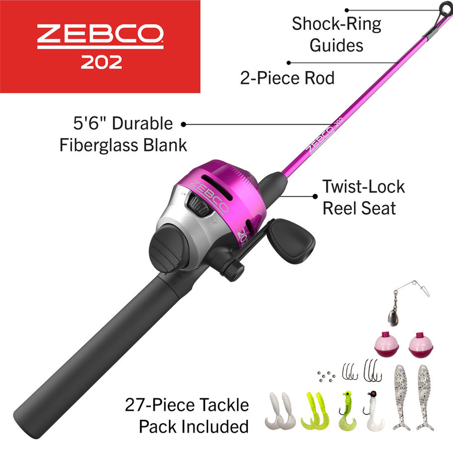 MODERATE-FAST ACTION: The famous Zebco 202 spincast combo features a 5-foot 6-inch 2-piece fishing pole and is paired with the easy-casting spincast reel, making this a great all-purpose fishing set-up. It’s moderate-fast action and medium-light power is ideal for targeting a wide variety of light and medium species from panfish to trout, walleye, bass and more EXPERTLY DESIGNED: Dependable and engineered to last, the 202 spincast combo was expertly designed with a durable fiberglass rod, comfortable EVA rod handle, Twist-Lock reel seat and a built-in hook keeper for safe transport to and from the water. This rod is strong enough to hold a 6-10-pound line weight and 1/16-3/4 oz lure weights and the 4 + Tip shock-ring guides make for super smooth casts SMOOTH PERFORMANCE: The spincast reel is constructed with all-metal gears, a stainless steel pick-up pin, and a 2.8:1 gear ratio with a line retrieval of 15 IPT (inches per turn). Featuring a dial-adjustable drag and QuickSet anti-reverse that stops your reel handle from moving backwards in order to create a solid hookset in the mouth of a fish. The right-hand reel has a mono line capacity of 110/10 yds/lbs and comes conveniently pre-spooled with 10-pound Zebco fishing line 27-PIECE TACKLE KIT: The tackle pack comes as a complete set ensuring you are ready to go catch your prize fish right away and includes 6 hooks, 6 split-shot sinkers, 3 swimbaits, 3 jig heads, 6 curly-tail grubs, 1 spinner attachment, and 2 bobbers TRUSTED: Since 1949, Zebco has been inviting people to explore the outdoors. Zebco products are warranted for a period of (1) year from date of original retail purchase against defects in workmanship and/or materials