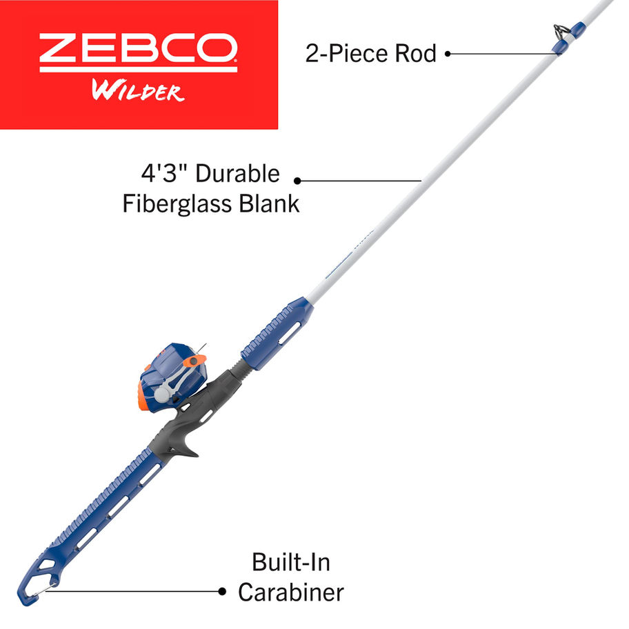 EASY-TO-USE: Zebco Wilder spincast reel and rod combo features a 4-foot 3-Inch 2-piece durable fiberglass rod and size 20 fishing reel. This easy-to-use and easy-to-store Wilder spincast combo is made with all-metal gears to stand tough for many fishing trips to come HANDS-FREE PORTABILITY: Perfect for on-the-go anglers the Wilder combo features a built-in carabiner for hands free portability. Its moderate action and medium power is ideal for targeting everything from panfish to trout and is designed to hold a 4-8-pound line weight and 1/16-1/4 oz lure weights FIT-TO-FISH: With components and rod length proportioned to aspiring anglers. The Wilder combo is simple, stylish, and size-appropriate for adventurers aged 6-9, with components and rod length proportioned to aspiring anglers. Get into gear with a spincast reel and fishing rod that fits your age, size and style SMOOTH PERFORMANCE: This size 20 spincast reel is constructed with all-metal gears and a 4.3:1 gear ratio for a silky-smooth retrieve. Featuring a dial-adjustable drag and QuickSet anti-reverse to stop your handle from moving backward and create a solid hookset in the mouth of a fish when reeling in your catch. The changeable right- or left-hand retrieve is pre-spooled with 6-pound Cajun fishing line so you can start your fishing adventure sooner TRUSTED: Since 1949, Zebco has been inviting people to explore the outdoors. Zebco products are warranted for a period of (1) year from date of original retail purchase against defects in workmanship and/or materials
