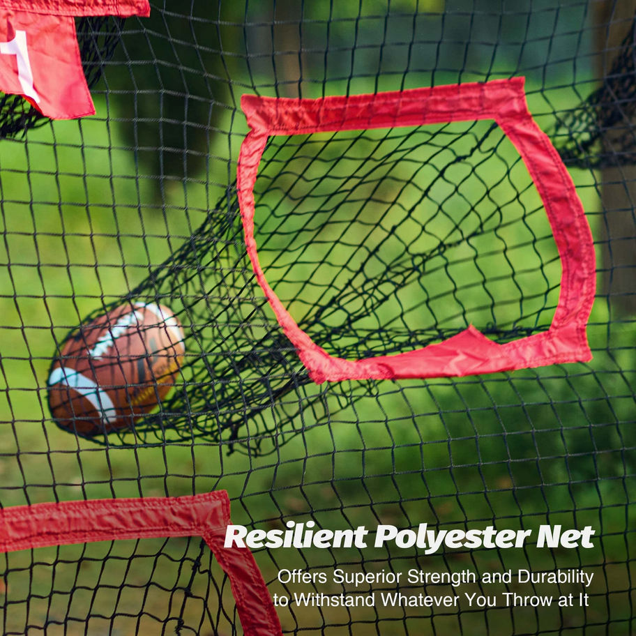 PERSONAL QB COACH: Zelus's 7'x7' football practice net is the perfect training aid for improving your throws on long, medium, and short yardage passes, preparing you to hit your throwing windows when the pressure’s on HELPFUL TARGET POCKETS: Our football throwing net features 5 integrated target pockets in key receiving locations for effective training, allowing you to boost your passing strength and accuracy from any distance DURABLE CONSTRUCTION: This portable barrier net features 7 ply knotless netting and double stitched seams to handle your hardest hits, while the fiberglass and coated steel frame provides years of corrosion free performance EXCEPTIONAL STABILITY: The hook and loop connections, lightweight yet strong metal supports, and 4 attached ground stakes hold the netting and frame securely in place to withstand strong throws whatever the weather EASY SETUP & PORTABILITY: Your QB trainer net from Zelus goes up in minutes thanks to the intuitive design and clear instructions; once taken down, this versatile training net fits into the provided travel bag for easy transport