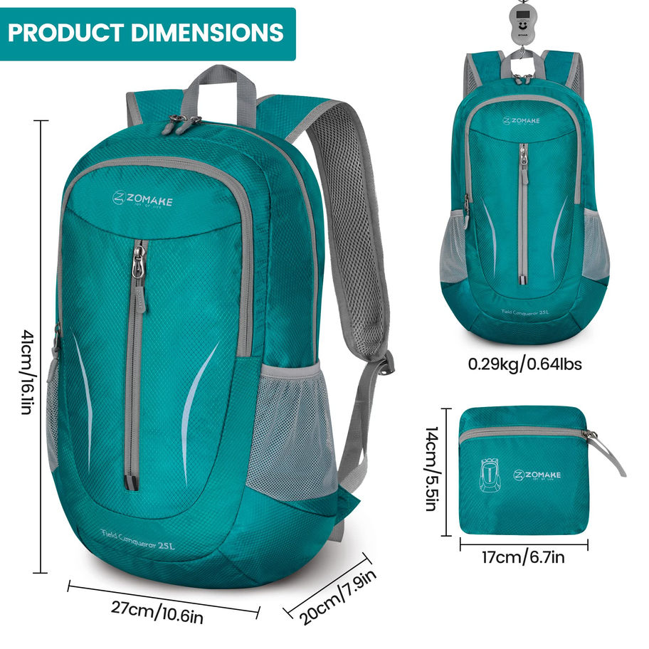 Reasonable and Orderly: Our ultralight packable backpack capacity is 25L,and the pocket structure layout is reasonable and orderly.One main bag can accommodate sandwich lunch boxes and inner partitions to accommodate A4 paper size files;One inner bag can store important small items such as passports;2 front bags can store small booklets such as travel guidelines;2 side bags can store water bottles and umbrellas Flexible and Convenient: Our ultra lightweight foldable backpack weight is 0.64 LB,the expansion size is 16.1×10.6×7.9 inch,and the folding size is 5.5×6.7×2 inch.Small foldable backpack is an ideal luggage bag for a plane.When it is not used,fold it into a compact pocket (sandwich size).It can be stored in anywhere of coat pockets,luggage,handbags,etc High-Quality Materials: Our light foldable backpack is water resistance(note:not completely waterproof).We use high-tear nylon fabrics and use the latest double-layer wear-resistant process to reinforce the backpack suture.After high-quality materials and light foldable hiking backpacks produced by good craftsmanship,it can effectively protect the items in the backpack.The zipper made of two-way SBS metal and high-quality resin materials greatly reduces the trouble of being stuck in the zipper Elaborate Design: The back of the ultra lightweight travel backpack packable we design perfectly fit the back of the human body,reducing the pressure of the shoulders to make the center of gravity more stable;The adjustable shoulder straps are used to adapt to different people.The new design brings a new sense of experience,comfortable,stylish Wide Range of Applications: Our ultra lightweight small packable backpack has many backpacks and rich colors.It is suitable for the use of activities such as the elderly,adults,men,women,hiking,vacation,shopping,cycling,sports and other activities.I believe you will like our quality and portable lightweight small foldable backpack
